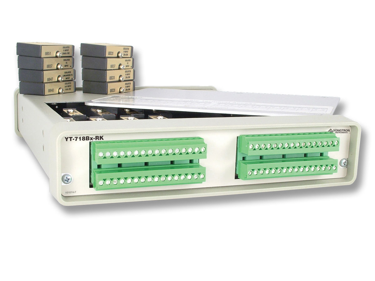 所有 YT-718Bx 仪器均配有四个可拆卸的 16 位螺钉端子连接器,以提供对内置 YT-8B 模块背板的访问。仪器安装在一个小型(9"L × 7.29"W × 1.52"H;22.9L × 18.5W × 3.86H cm)外壳中,该外壳由铝制底座和全钢环绕式组成。
