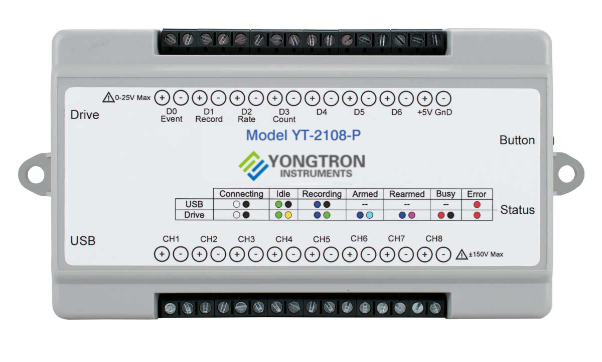 YT-2108-P 型号以实惠价格提供良好的模拟性能。8 个模拟输入通道提供差分测量灵活性和可编程±每通道 2.5、5、10 V 双极性以及 0-5 和 0-10 V 单极性范围。差分输入配置提供噪声抑制,轻松适应单端信号源,并具有高达 ±150 V 直流或峰值交流的保护,因此不可避免的测量事故不会损坏仪器。双极性范围测量高于和低于零的信号,而单极性范围的分辨率实际上翻倍。前端馈电一个固定分辨率的16位ADC。YT-2108-P 的大采样吞吐率为 160 kHz。