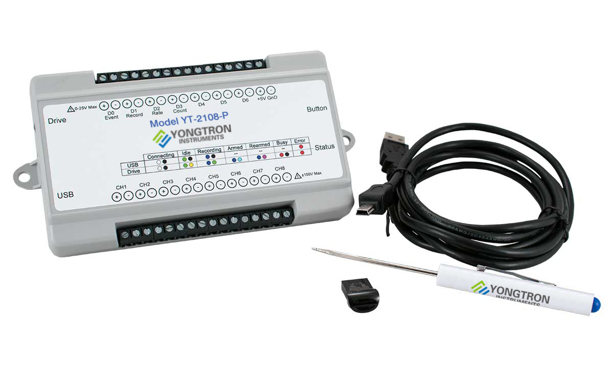 包括一台 YT-2108-P 仪器、一根 6 英尺长的 USB 电缆、一把用于信号连接的螺丝刀,WinYongTron 软件的 32GB USB 闪存驱动器。