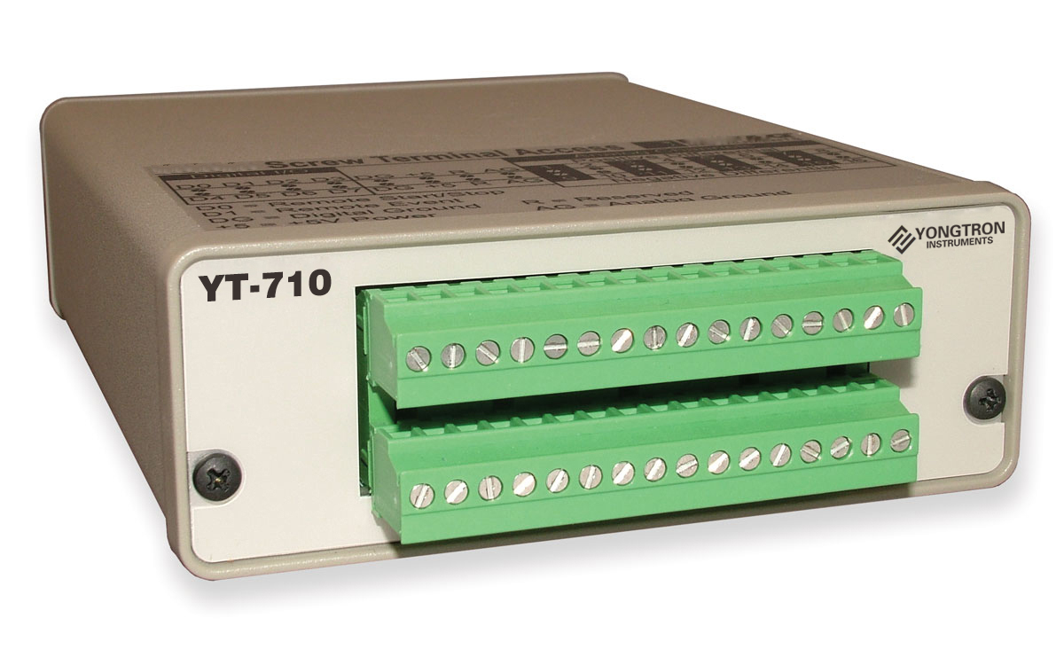 YT-710 通用 USB 数据采集系统,带 WinYongTron 软件。具有 8 个差分或 16 个单端模拟输入通道、每秒 4,000 个样本吞吐量、14 位测量分辨率和满量程范围 ±1.25、±2.5、±5、±10 V 满量程。