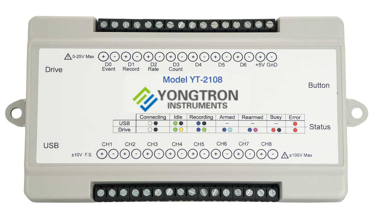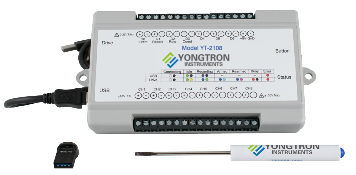 YT-2108高速USB数据采集和数据记录系统,带WinYongTron软件和32GB USB闪存驱动器。具有 8 个差分模拟输入通道、12 至 16 位测量分辨率、±10V 满量程范围以及独立数据记录到可移动 USB 拇指驱动器。包括一台 YT-2108 仪器、一根 6 英尺长的 USB 电缆、一把用于信号连接的螺丝刀、以及一个带有 WinYongTron 软件的 32GB USB 闪存驱动器和校准证书