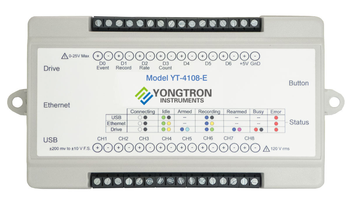 YT-4108高速 USB 和以太网数据采集系统,带 WinYongTron 软件。具有 8 个差分模拟输入通道(将总共 4 个以上的通道记录到 WinYongTron 需要解锁代码)、12 至 16 位测量分辨率、±200、±500 mV、±1、±2、±5、±10 V 满量程的满量程范围,以及独立数据记录到可移动 USB 拇指驱动器。